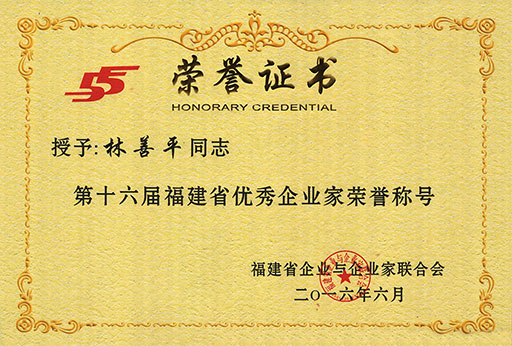 為弘揚(yáng)優(yōu)秀企業(yè)家深化改革、科學(xué)管理、與時俱進(jìn)、勇于創(chuàng)新的開拓精神,激勵廣大企業(yè)家敢為天下先、愛拼才會贏的闖勁,為推動福建省產(chǎn)業(yè)轉(zhuǎn)型升級和經(jīng)濟(jì)持續(xù)健康發(fā)展建功立業(yè),近日,福建省企業(yè)與企業(yè)家聯(lián)合會組織開展了每兩年評選一次的福建省優(yōu)秀企業(yè)家評選工作,并于2016年6月24日決定授予98位企業(yè)經(jīng)營管理者“第十六屆福建省優(yōu)秀企業(yè)家”榮譽(yù)稱號,虹潤公司董事長林善平榮獲該榮譽(yù)稱號。