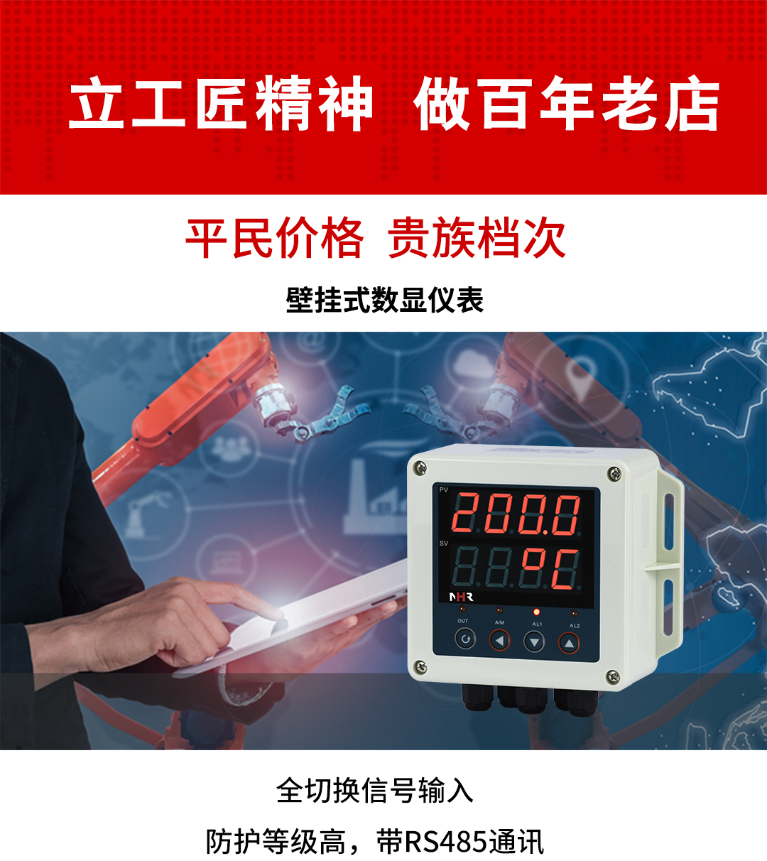 虹潤(rùn)公司是專業(yè)生產(chǎn)數(shù)顯表的國(guó)家專精特新“小巨人”企業(yè),生產(chǎn)的壁掛式數(shù)顯儀表,具有全切換信號(hào)輸入,高抗干擾,IP65防護(hù)等級(jí),全隔離設(shè)計(jì),變送輸出或RS485通訊等特點(diǎn)。產(chǎn)品獲得巡回檢測(cè)顯示方法及裝置、工業(yè)模塊的導(dǎo)軌式安裝結(jié)構(gòu)等2項(xiàng)國(guó)家發(fā)明專利,主持起草工業(yè)過程控制系統(tǒng)用模擬輸入兩位或多位輸出儀表、物聯(lián)網(wǎng)智能溫度儀表通用技術(shù)條件等2項(xiàng)國(guó)家標(biāo)準(zhǔn),,以及通信系統(tǒng)多通道數(shù)據(jù)采集控制終端規(guī)范軍用標(biāo)準(zhǔn),參與國(guó)際5G標(biāo)準(zhǔn)制定,取得簡(jiǎn)易數(shù)顯儀表等3項(xiàng)相關(guān)軟件著作權(quán)。產(chǎn)品廣泛應(yīng)用于電力、石化、冶金、化工、造紙、食品、輕工、制藥、熱處理、水處理、機(jī)械配套等各種工業(yè)現(xiàn)場(chǎng)。