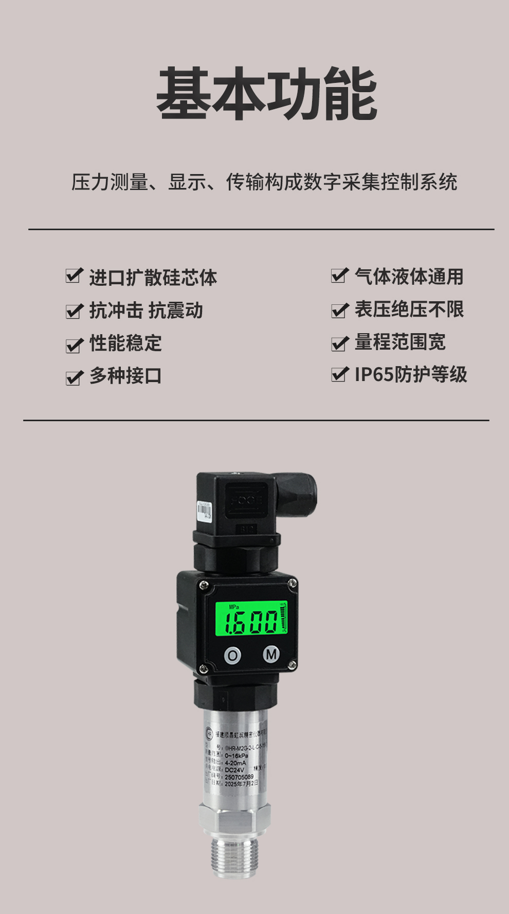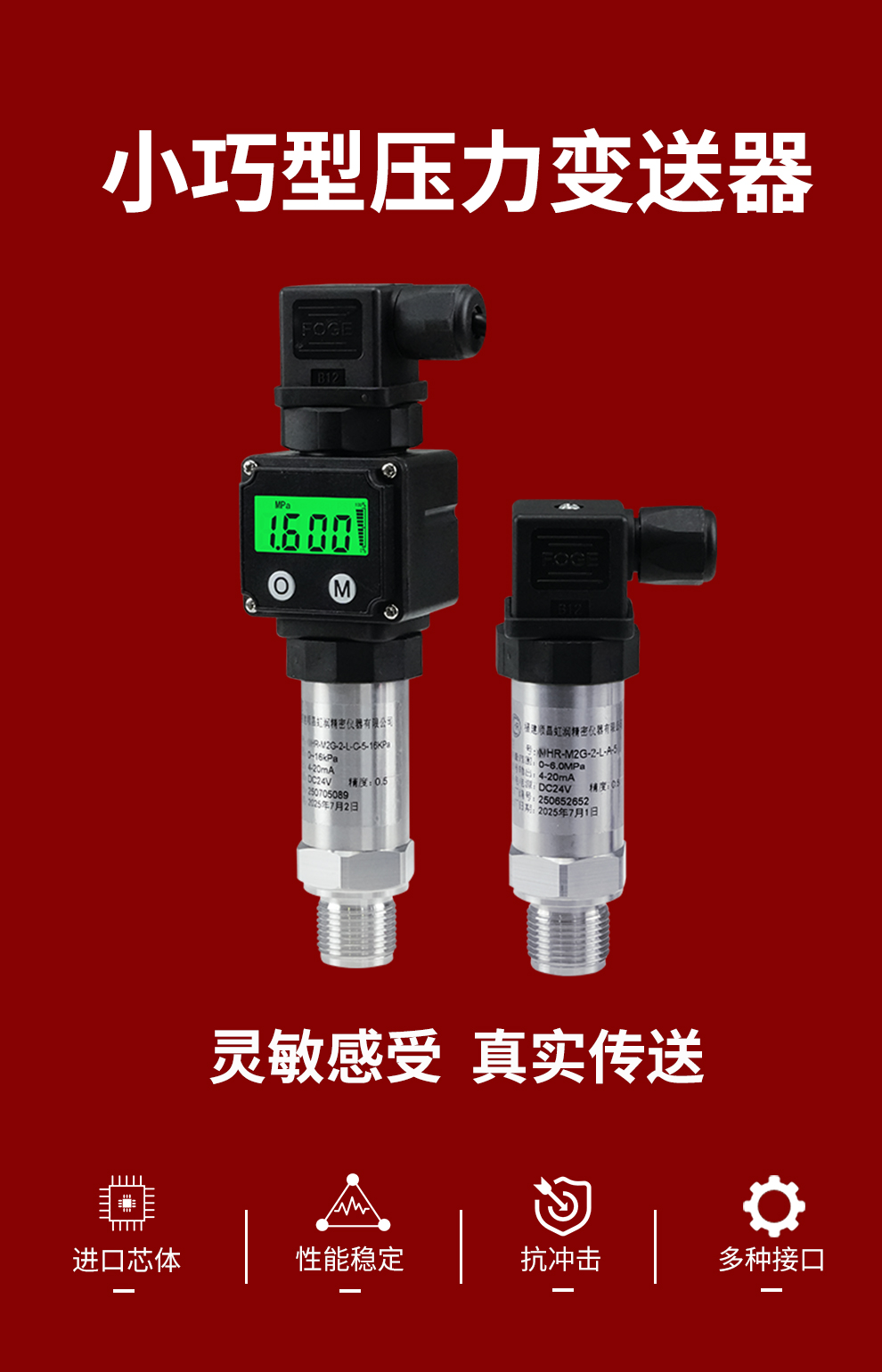 虹潤公司是專業(yè)生產(chǎn)壓力變送器的國家專精特新“小巨人”企業(yè),生產(chǎn)的小巧型壓力變送器,具有采用進(jìn)口芯體,量程范圍寬,抗沖擊抗震動,多種螺紋接口,性能穩(wěn)定等特點(diǎn)。產(chǎn)品獲得一種數(shù)字顯示低功耗壓力表、一種信號發(fā)生器裝置等2項(xiàng)國家發(fā)明專利,主持起草工業(yè)過程控制系統(tǒng)用模擬輸入兩位或多位輸出儀表、工業(yè)過程測量和控制系統(tǒng)用壓力/差壓變送器等2項(xiàng)國家標(biāo)準(zhǔn),通信系統(tǒng)多通道數(shù)據(jù)采集控制終端規(guī)范軍用標(biāo)準(zhǔn),以及現(xiàn)場設(shè)備集成等5項(xiàng)智能制造國家標(biāo)準(zhǔn),參與國際5G標(biāo)準(zhǔn)制定,取得數(shù)顯壓力表等2項(xiàng)相關(guān)軟件著作權(quán)。產(chǎn)品廣泛應(yīng)用于化工、食品、制藥、電力、設(shè)備配套、供暖、水處理、樓宇等行業(yè),需精準(zhǔn)測量流體壓力的現(xiàn)場。