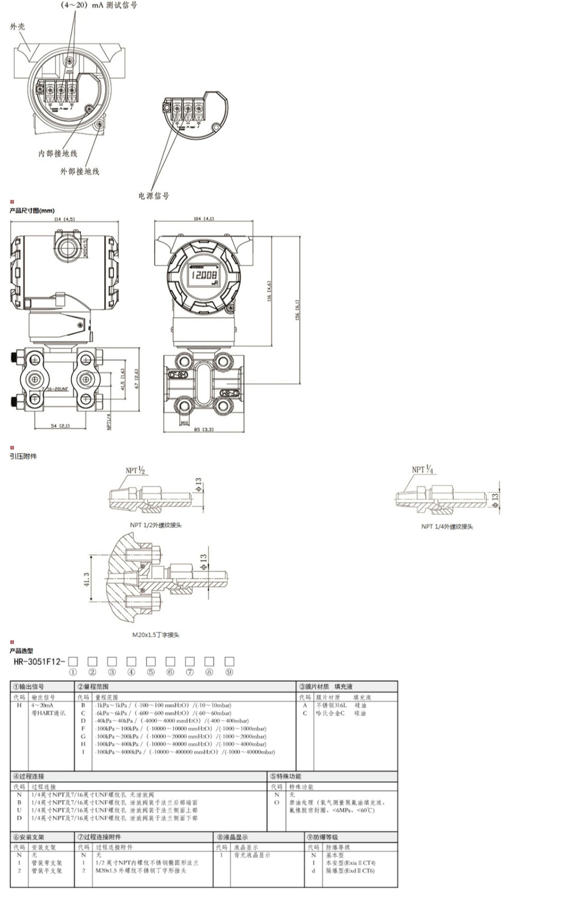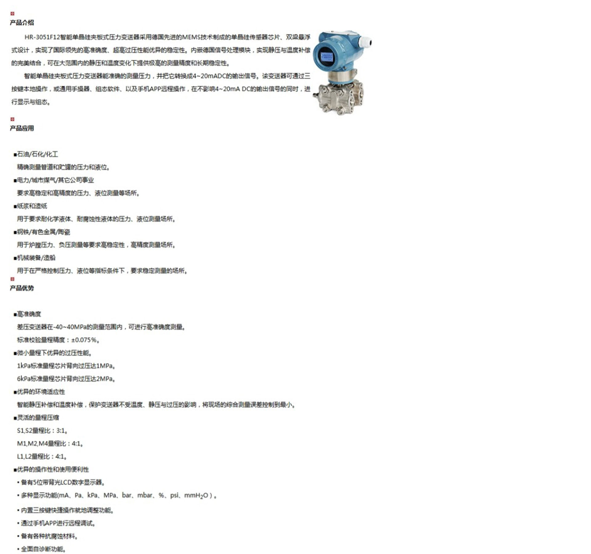 HR-3051F12智能單晶硅夾板式壓力變送器能準(zhǔn)確的測量壓力,并把它轉(zhuǎn)換成4~20mADC的輸出信號。該變送器可通過三按鍵本地操作,或通用手操器、組態(tài)軟件、以及手機(jī)APP遠(yuǎn)程操作,在不影響4~20mA DC的輸出信號的同時,進(jìn)行顯示與組態(tài)。
